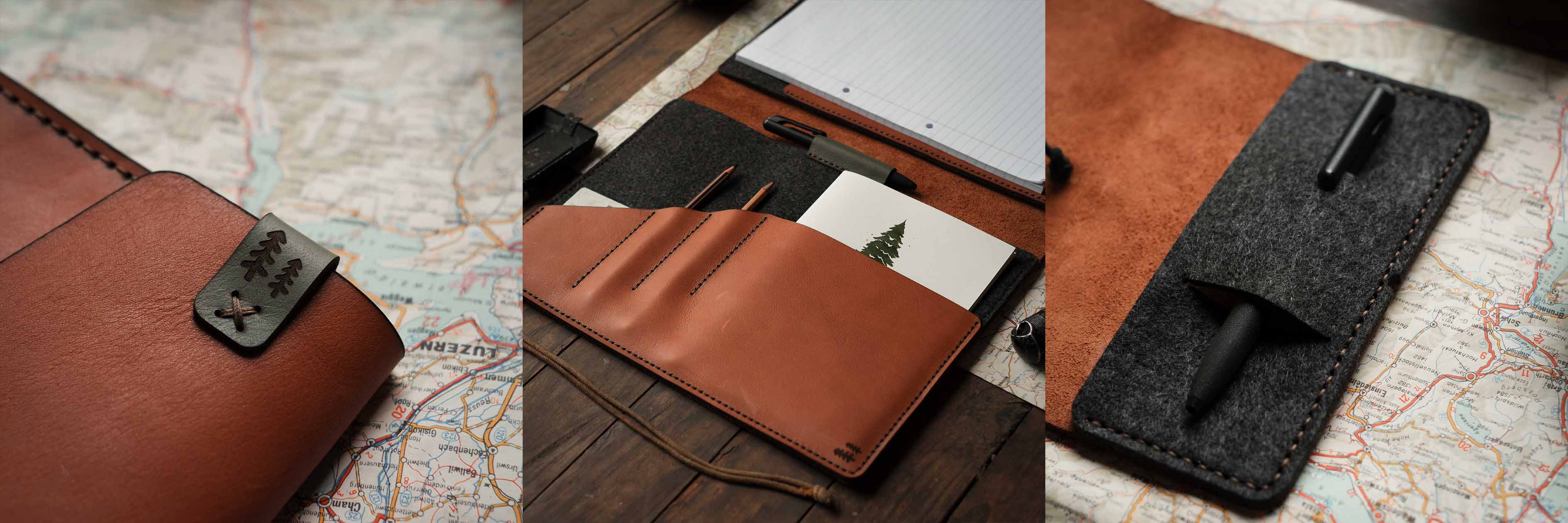 Goods are made with full grain, veg tanned leather, hand stitched with waxed thread, and 100% recycled PET felt.