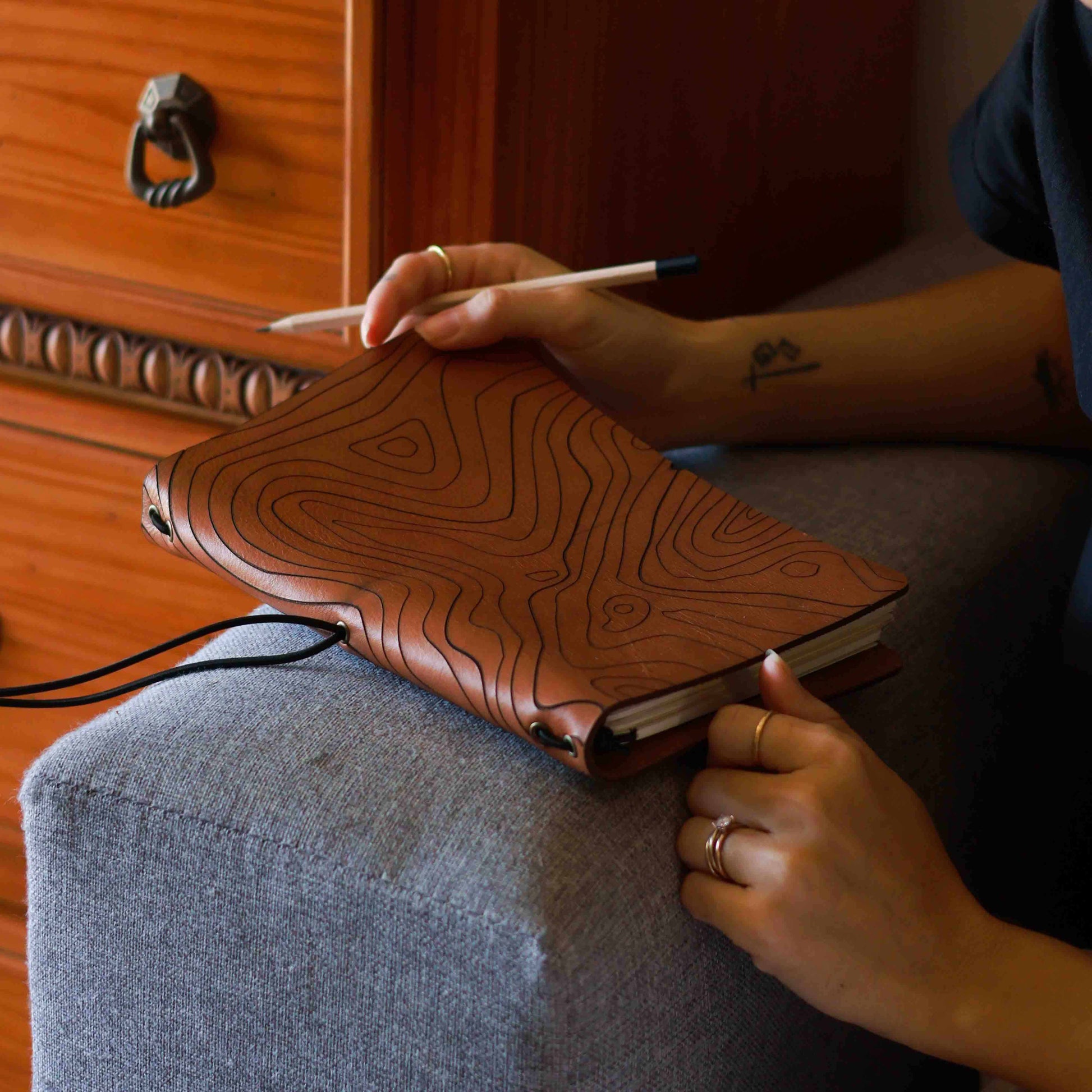 Looking for the perfect writing companion for your outdoor adventures? This A5 Leather Journal Cover from our Adventure Range might be just the right fit. Made with high-quality leather, it's sturdy enough to withstand all your travels, whether in the office or the great outdoors.