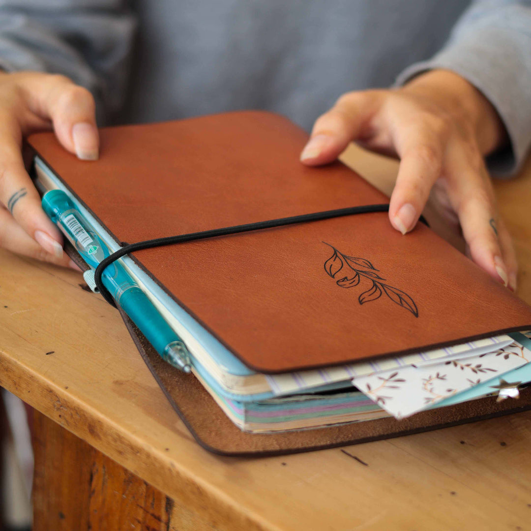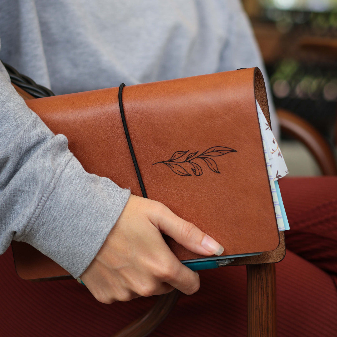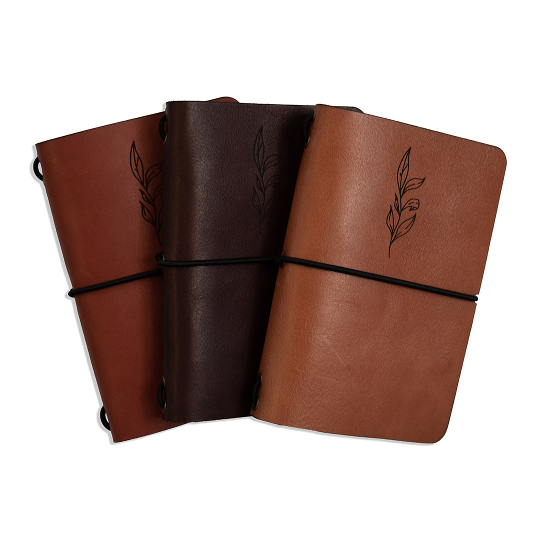 Experience the flourishing beauty of the Floral Range with our A5 Leather Journal Cover. Handcrafted with durable leather, this cover is the perfect accessory for the office or the great outdoors. Let your thoughts bloom with every use.