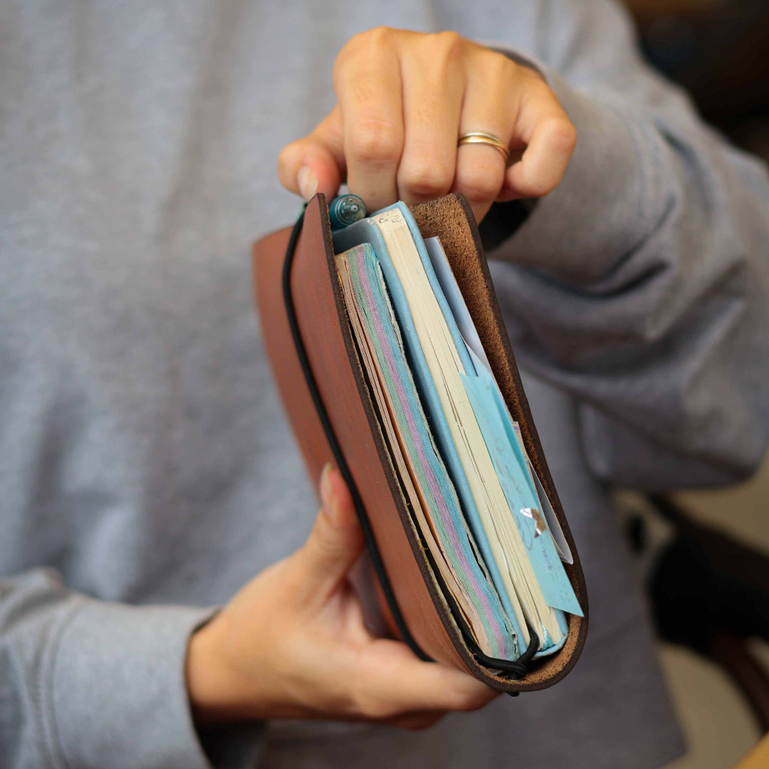 With the extra elastic band you can fit up to three thinner notebooks within the cover at the same time.